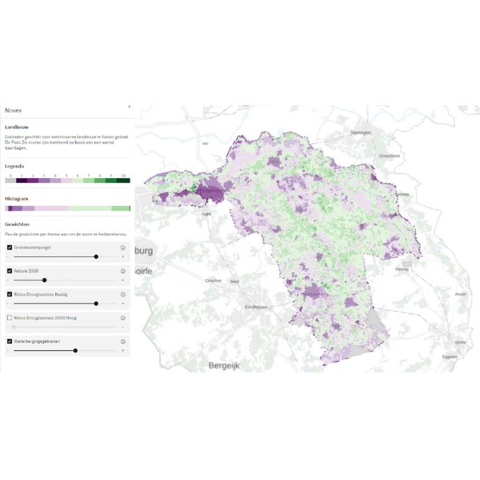Om de geschiktheid voor landbouw te bepalen, kunnen gebruikers verschillende “gewichten” toekennen aan factoren zoals de afstand tot natuurgebieden en de hoogte van de grondwaterstand. Door dit interactief te maken, kunnen gebruikers de impact van deze gewichten direct inzien. Dit geeft planologen en beleidsmedewerkers een krachtig instrument om belangen af te wegen en ruimtelijke consequenties te begrijpen. Stakeholders kunnen meegenomen worden in de afweging zodat er meer beeld en begrip van de belangenafweging ontstaat.