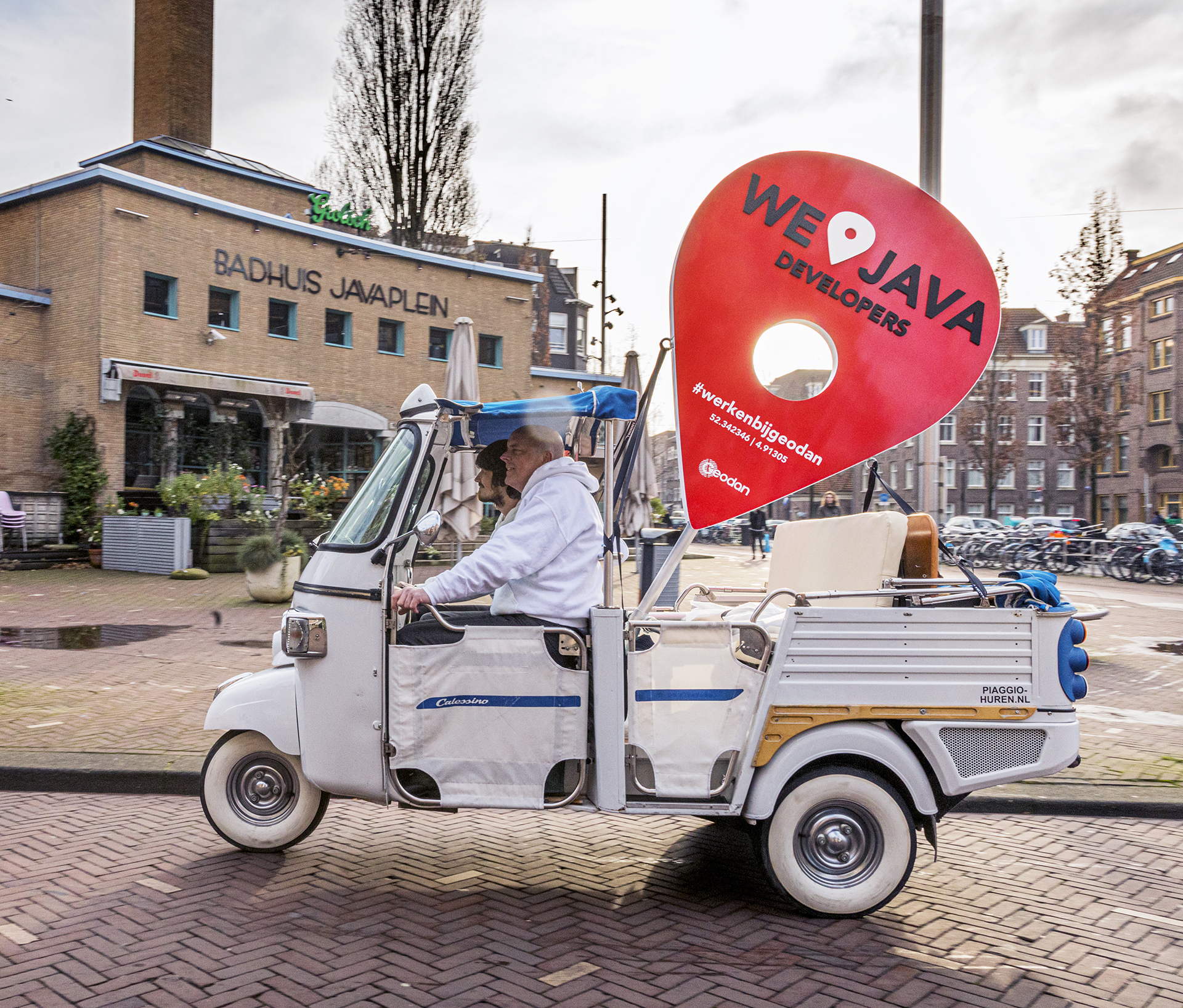 Zoektocht naar Java-developers start op Javaplein Een tuktuk reed afgelopen woensdag urenlang rondjes op het Javaplein, op zoek naar Java-developers. Achter op de tuktuk prijkte...